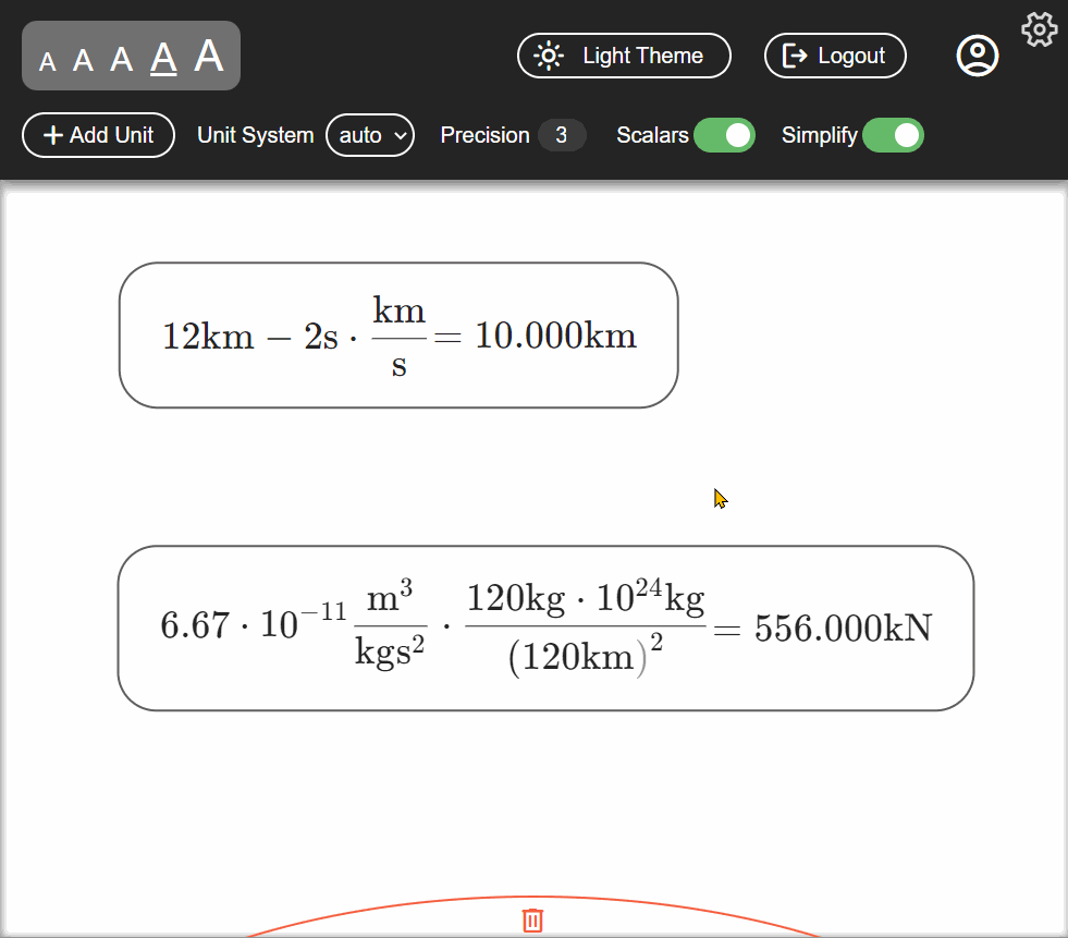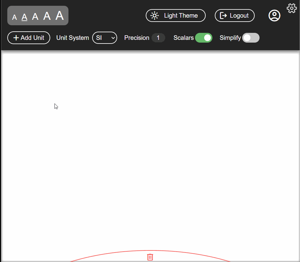 As shown above, users can enter quantities and units on the canvass. To take these equations taken apart, simply double-click on a section of your equation. To put them back together, simply place an equation fragment onto a placeholder or elsewhere within an equation.